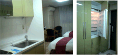 靴を脱いで上がり、こんな大型冷蔵庫、洗濯機、ミニキッチンも完備。