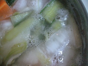 ●水キムチのもとを1リットルのお水で溶かして沸騰させて冷ましておく(つけ汁)