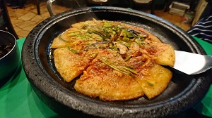 肉とキムチ、野菜の入ったチヂミ。鉄板であつあつで提供。 あまり見かけないパンケーキのような厚さのチヂミ