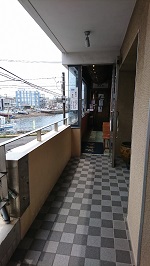 階段を上って突き当りに入り口です。 むこうに港が見えますね