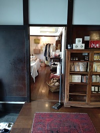 左手にだしや塩など(たぶんお料理に使われているもの)を陳列している棚と、 その奥に雑貨ショップが併設