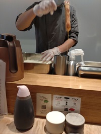 ちょうど私の目の前で店主の方がオーダーの入ったとんかつをまずお肉を切って 衣を付けはじめました。