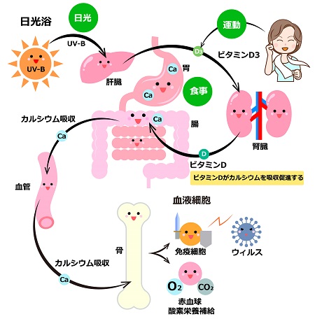 <ビタミンDの働き、カルシウム吸収、免疫のながれ>