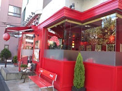 人形町の駅から5分。 アメリカンテイストの真っ赤でおしゃれな外観(中も)
