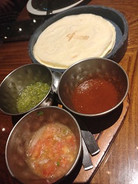 のパフォーマンスでみんなテンションが上がります。 これに付属でトルティーヤと3種類のソースがついてきて、