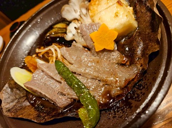 牛肉の朴葉焼き (味噌と具を葉の上で焼いたもの)